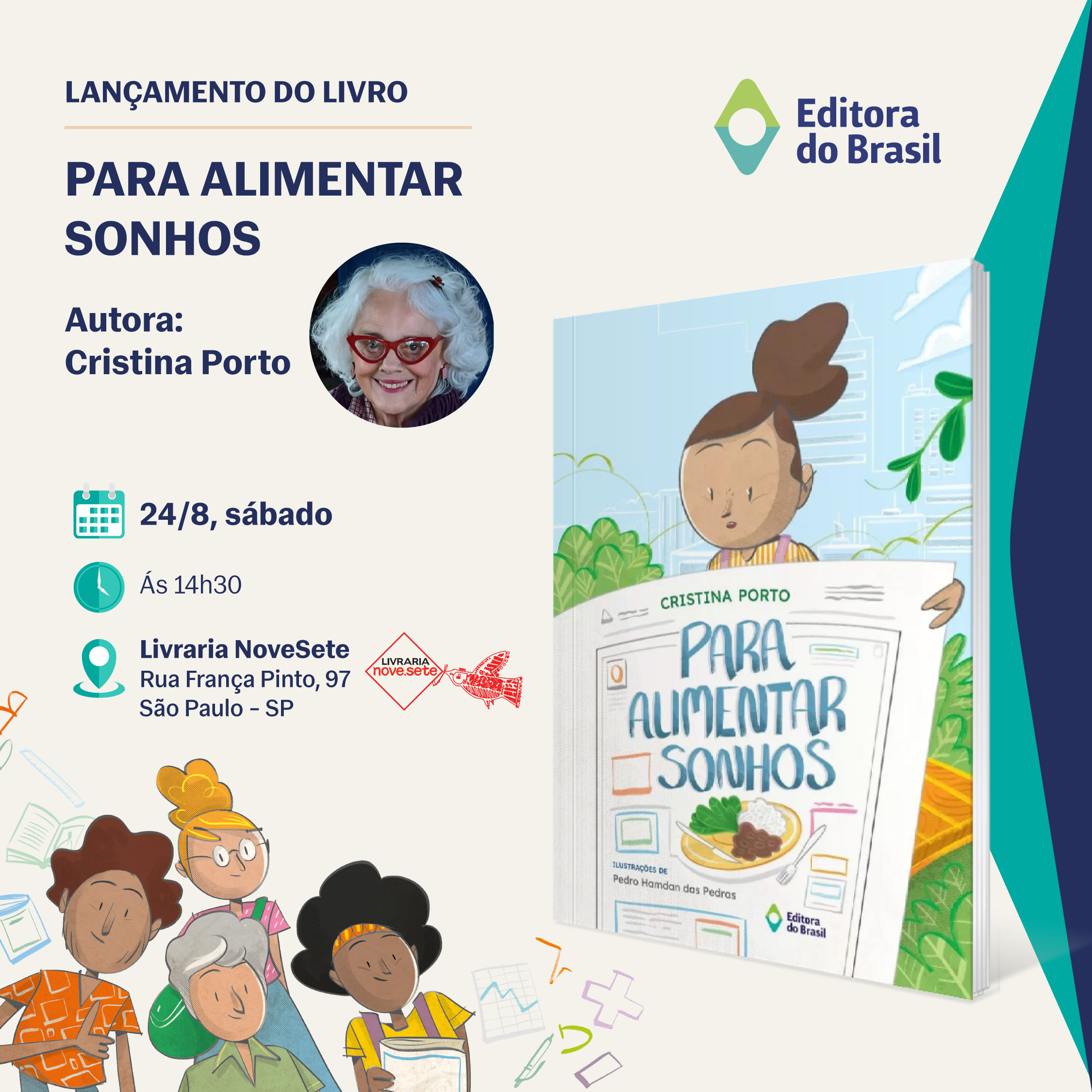 Temos o imenso prazer de convidá-los para o lançamento da obra “Para Alimentar Sonhos,” de Cristina Porto. O evento acontecerá no dia 24 de agosto, às 14h30, na Livraria Nove Sete, em São Paulo. Venha fazer parte desta tarde especial